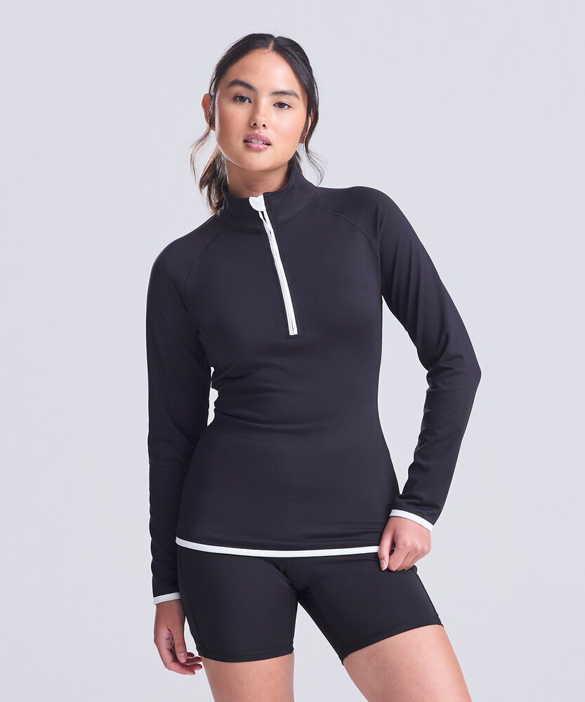 AWDis' own CoolFit blended fabric containing elastane that provides stretch for comfort and a great fit, girlie fit, reflective tab at back of neck helps keep ear phone cords in place, self-fabric contrast colour binding at zip, cuffs and hem, raglan sleeve design creates ease of movement, 1/2 zip with stand-up collar for warmth, chin guard prevents irritation, simple tear off label makes it perfect for rebranding, UPF 30+ UV protection.
