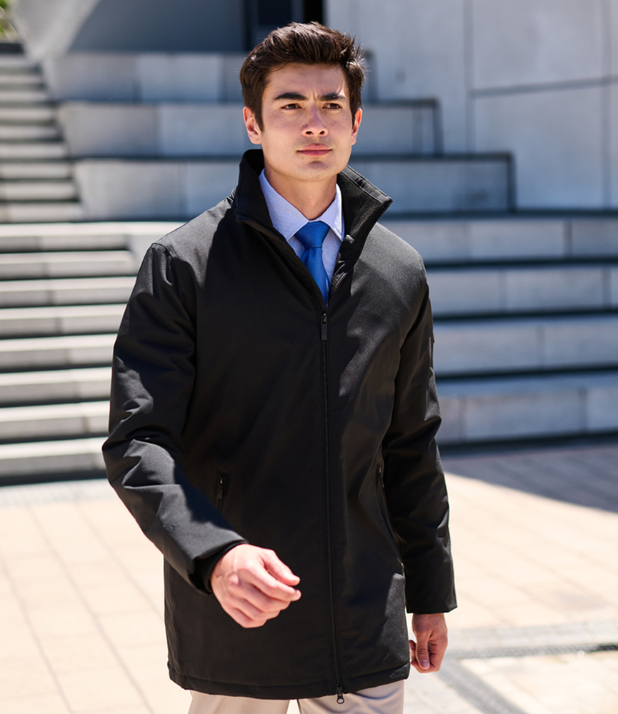 Isotex® 10000 polyester stretch outer. In transition to using recycled polyester. Recycled Warmloft insulation. Waterproof with taped seams. Breathable. Concealed hood. Collar high full length two way zip. Two front zip pockets. Storm cuffs.