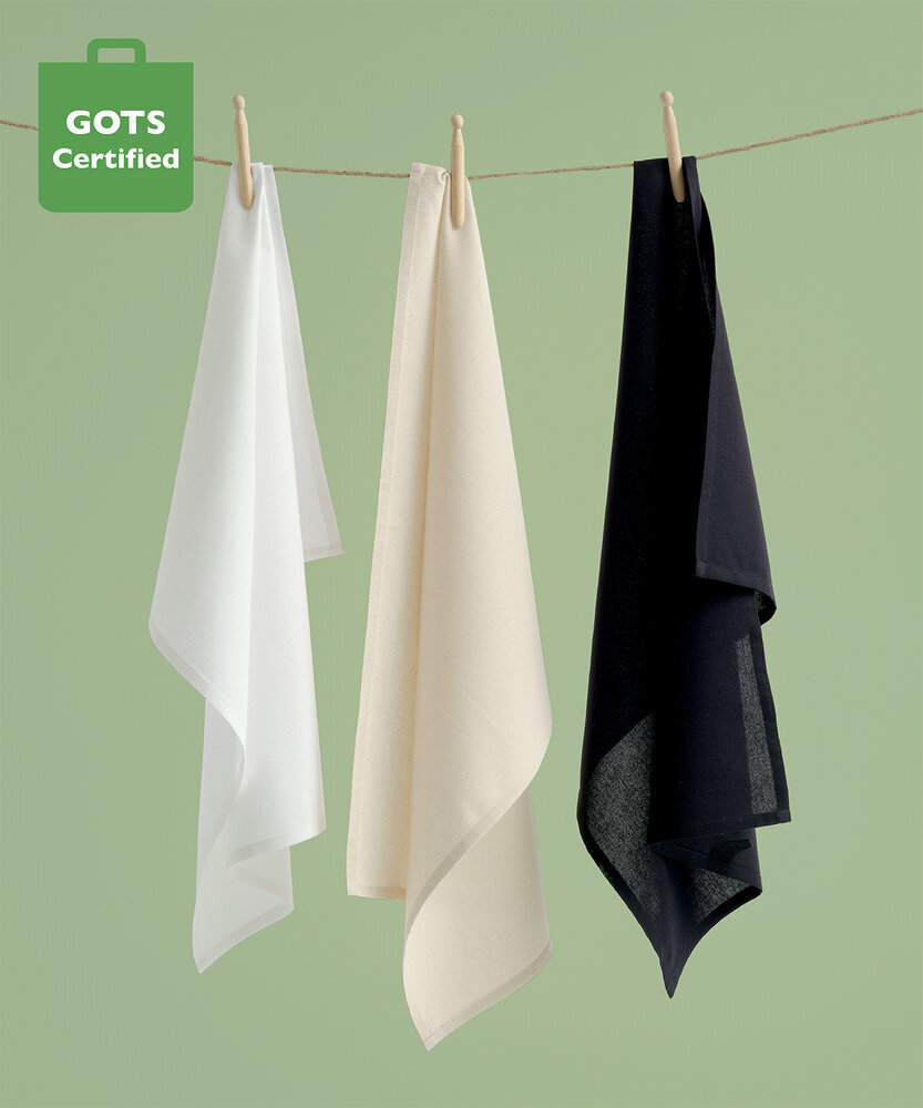 Tea Towel. Herringbone hanging loop in the corner. Hemmed edges. Soft-feel fabric. Packed flat ready for printing. Certified 200gsm organic cotton.