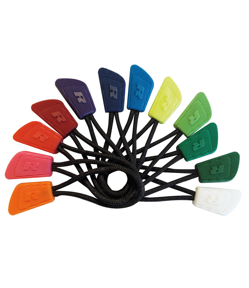 Polyurethane tag with polyester tie. Black cord.Coloured branded tag.Co-ordinates with any Result zip pull style.Sold in packs of 10.